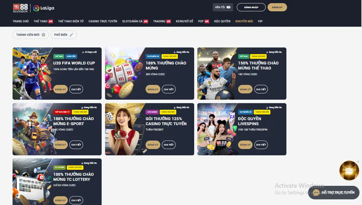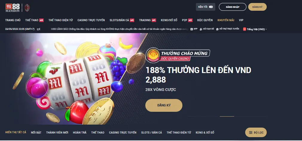 Lưu ý là để không bấm nhầm vào website đã bị bên khác chặn, mạo danh thì anh em hãy nhấn vào link M88. M88 đã hiểu rõ nhu cầu người dùng nên hỗ trợ nhiều ngôn ngữ khác nhau cho anh em có sự đa dạng hơn. Anh em được bấm chuyển sang bất cứ ngôn ngữ nào theo nhu cầu như Anh, Philippin, Thái Lan, Tiếng Việt hay Indonesia. Tiếp đó, nhìn lên giao diện trang chủ, hãy bấm “Đăng ký”.