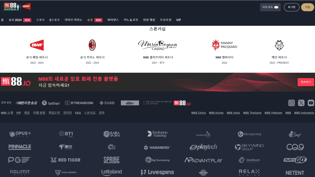 M88는 2003년부터 공식적으로 운영된 아시아 최고의 온라인 베팅 사이트로서 신뢰받는 브랜드입니다. 현재 M88의 본사는 필리핀의 마닐라 중심지에 위치하고 있습니다. M88는 아시아 여러 국가로 운영 규모를 확장한 이후, 유명한 도박 기관인 PAGCOR로부터 완전히 합법적인 온라인 베팅 사업 허가를 받았습니다. 이 아시아 최고의 베팅 사이트가 제공하는 모든 베팅 제품은 매우 매력적입니다. 현재 가장 인기 있는 베팅 게임으로는 스포츠 베팅, 축구 베팅, Esports, 온라인 카지노, 로또, 닭싸움, 복권, 드래곤 타이거, 슬롯 게임 등이 있습니다.