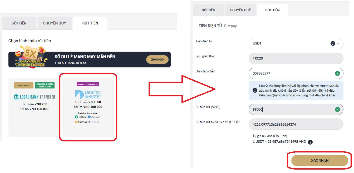 - Bước 3: Ấn chọn “Loại giao thức”, “Địa chỉ ví tiền”. Bạn hãy lưu ý phần “Tỷ giá” và ấn chọn “xác nhận” để tiếp tục.