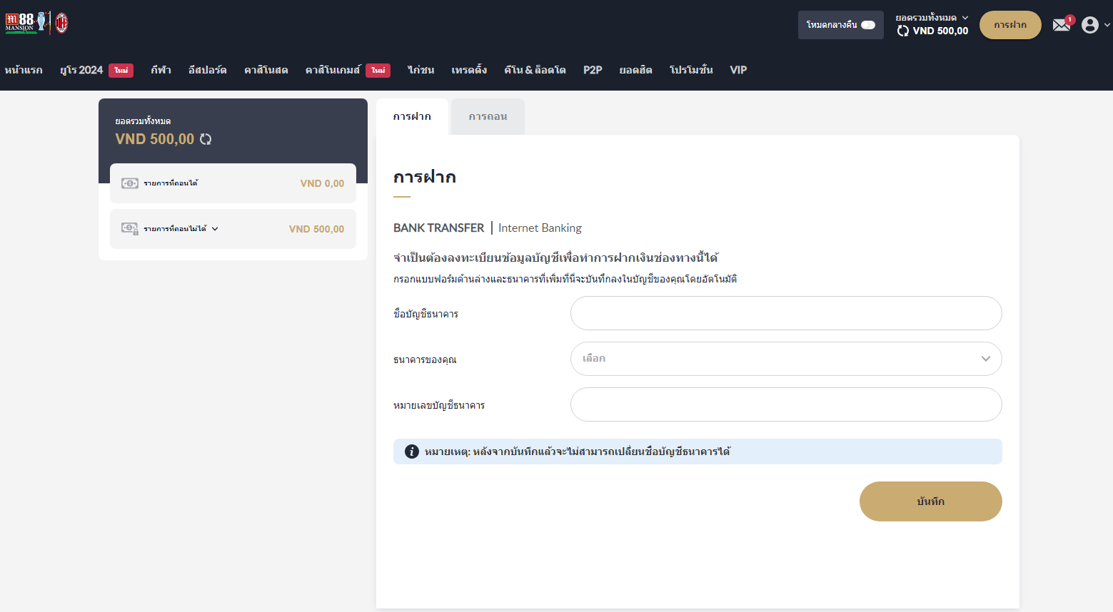 ขั้นตอนที่ 5: ทำการโอนเงินออนไลน์ไปยังหมายเลขบัญชีที่ระบบ M88 ให้ ในขั้นตอนนี้พี่น้องต้องระบุข้อมูลการโอนเงินให้ถูกต้อง ข้อมูลที่ต้องมีในการฝาก ประกอบด้วย: