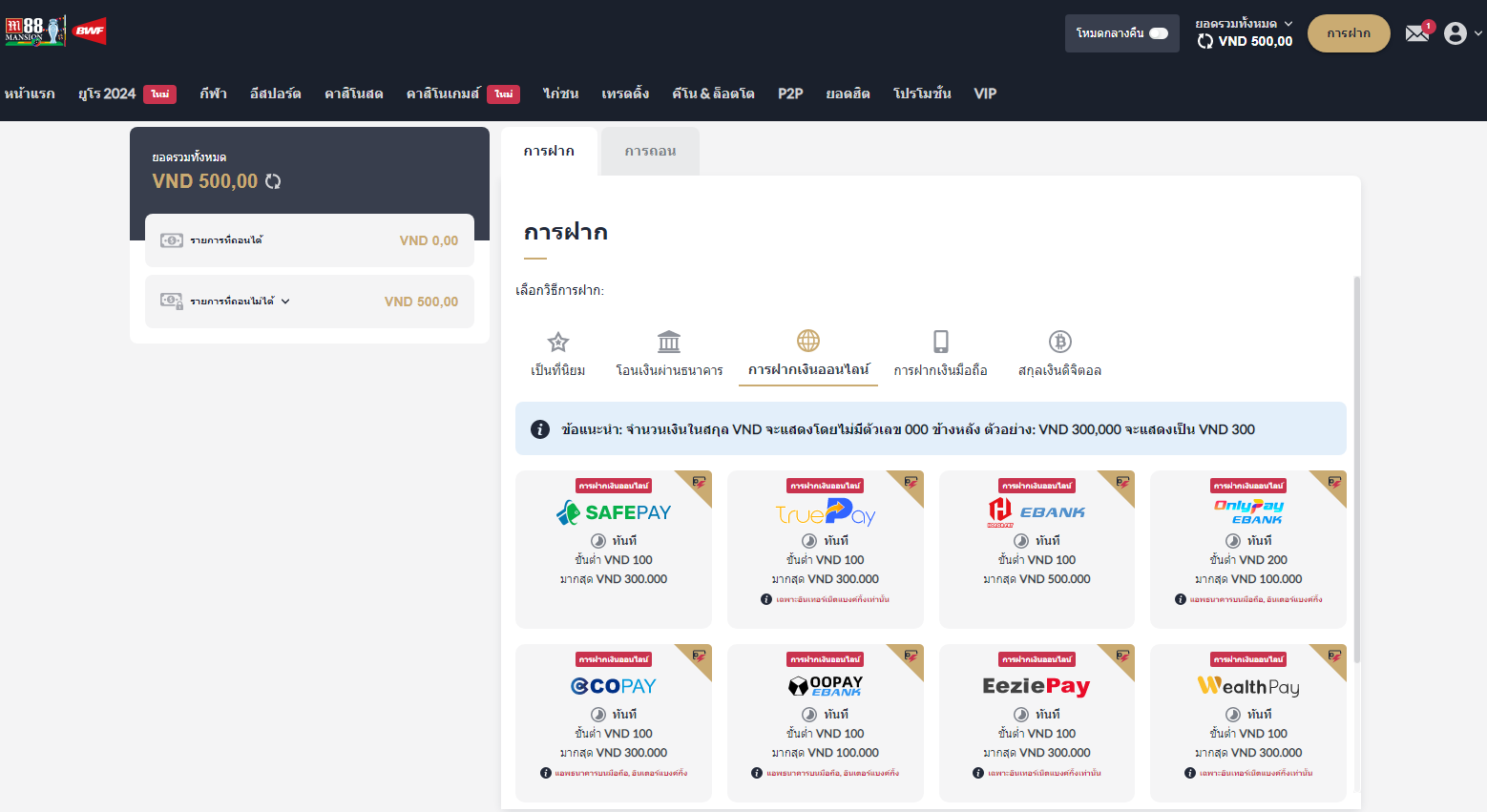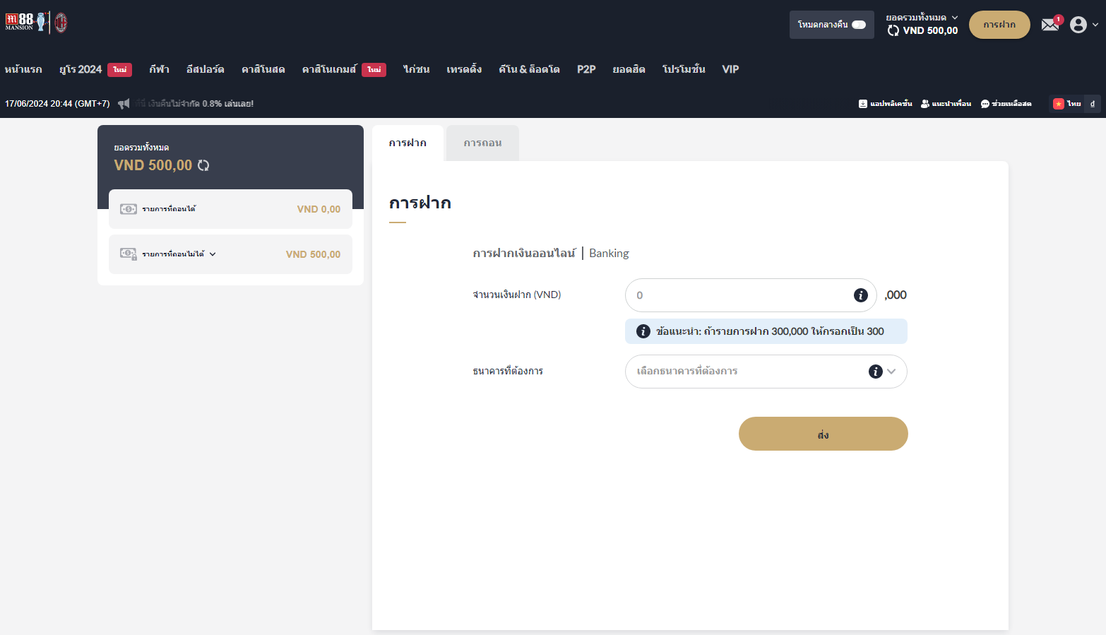 - ที่หน้าแรกของ M88: กรอกจำนวนเงินที่ต้องการฝากแล้วคลิก “ฝากเงิน” ในขั้นตอนนี้ให้คุณตัดเลขศูนย์สามตัวสุดท้ายออกจากจำนวนเงินที่ต้องการฝาก เช่น ถ้าคุณต้องการฝาก 2,000,000 ให้กรอก 2000